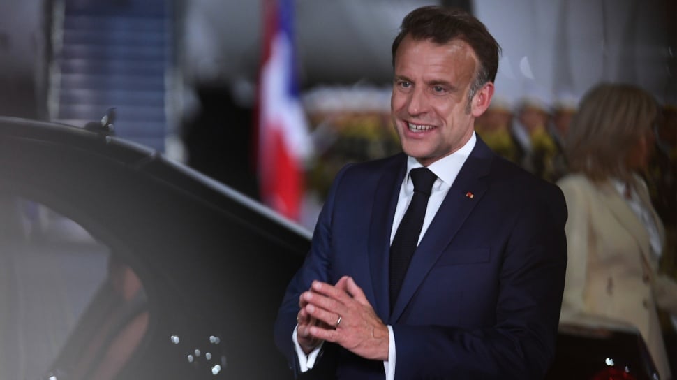 Presiden Prancis Emmanuel Macron menyapa wartawan setibanya di Pangkalan Udara TNI AU Halim Perdanakusuma, Jakarta. [ANTARA FOTO/Hafidz Mubarak A/sgd/foc]