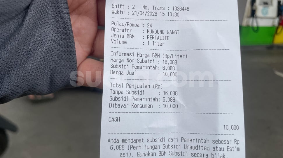 Berdasarkan transaksi yang dilakukan jurnalis Suara.com di SPBU tersebut pada Selasa (21/4/2026), struk pembelian mencantumkan harga non-subsidi sebesar Rp16.088 per liter. Namun, karena adanya subsidi dari pemerintah, harga yang dibayarkan konsumen sebesar Rp10.000 per liter.