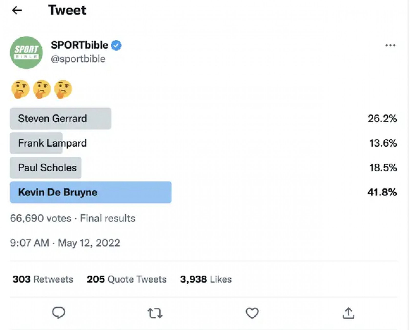 De Bruyne berada di peringkat pertama disusul Gerrard di peringkat dua, Scholes di peringkat tiga, dan Lampard di peringkat empat