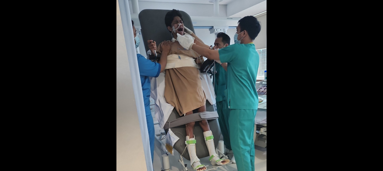 Dalam foto itu terlihat beberapa perawat sedang membantu David dalam proses pemulihannya agar sembuh dari sakit yang dideritanya pasca penganiayaan.