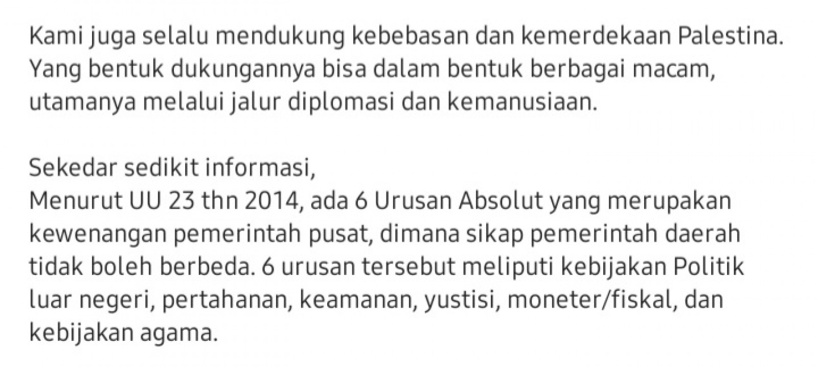 "Menurut UU no.23 tahun 2014, ada 6 urusan absolut yang merupakan kewenangan pemerintah pusat, di mana sikap pemerintah daerah tidak boleh berbeda," tulisnya mengawali.