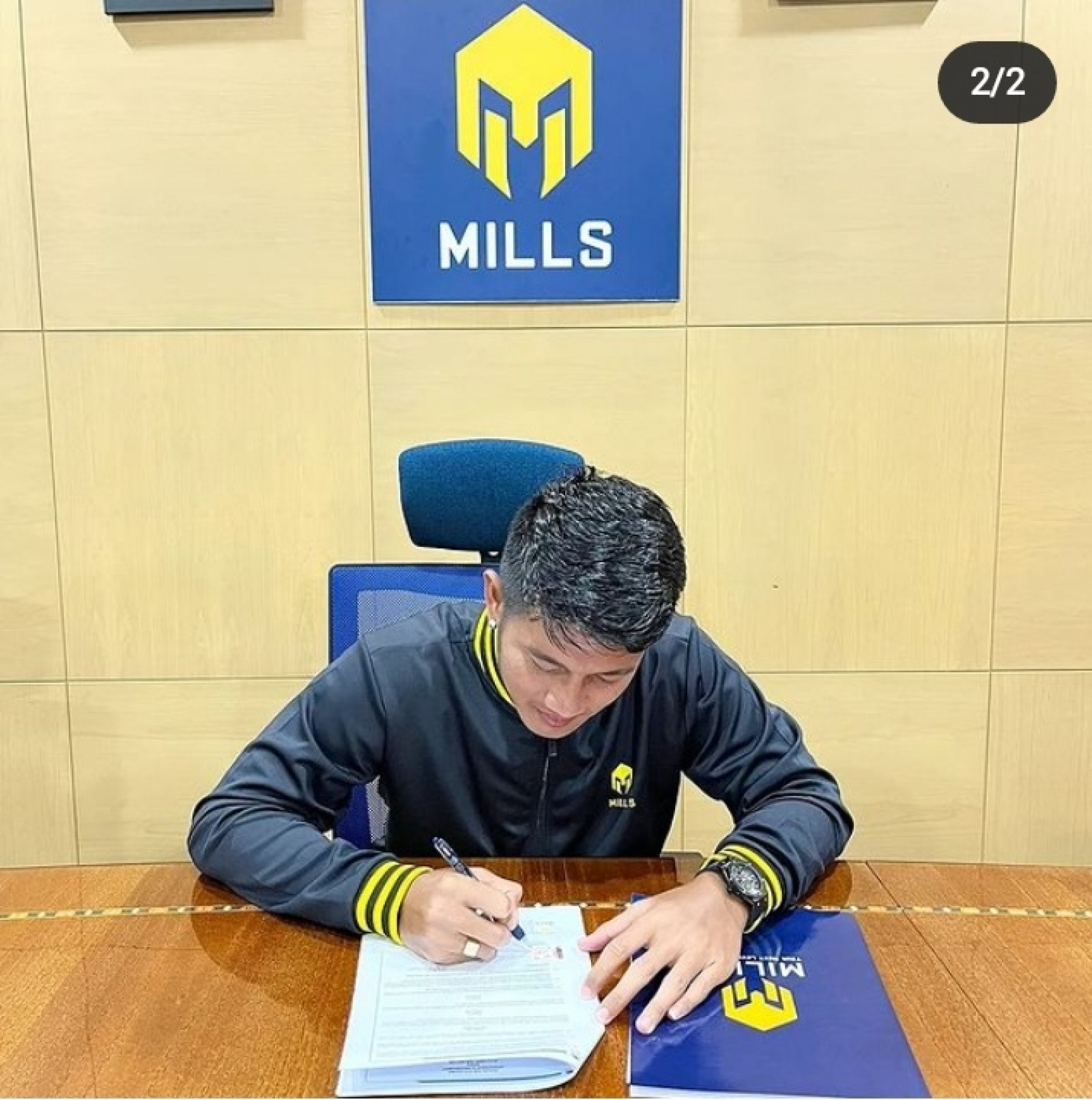 Dalam unggahannya tersebut, Putu Gede memposting dua buah foto yang pertama menunjukkan map berwarna biru dengan logo MILLS Sport.