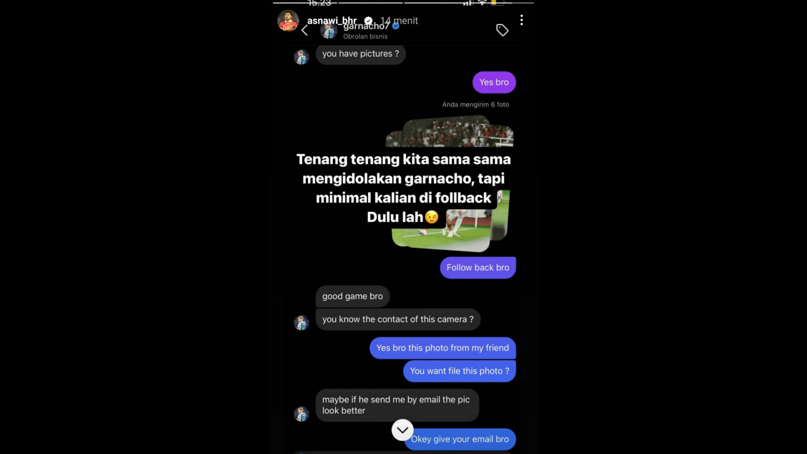 Lantas, Garnacho meminta kontak email sang fotografer kepada Asnawi. Menurutnya, gambar yang dikirim lewat email hasilnya lebih baik daripada gambar yang dikirim lewat Instagram. (*/Dinda)