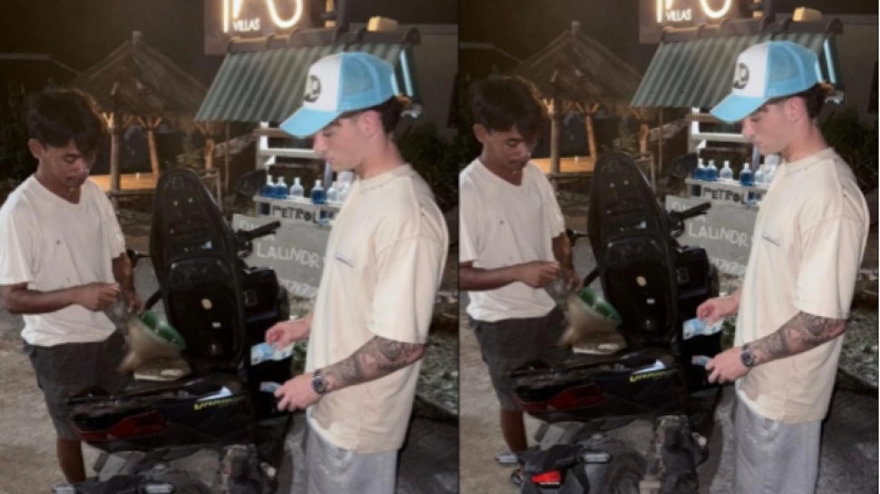 Motor sewaannya kehabisan bensin, Ivan Guevera yang merupakan pembalap Moto2 ini mengisi bahan bakar di warung.