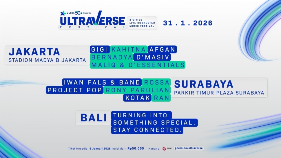Suara.com - ULTRAVERSE FESTIVAL akan mencatatkan format baru dalam peta festival musik Indonesia dengan menggelar satu konser yang berlangsung serentak di 3 kota, yaitu Jakarta, Surabaya, dan Bali, yang terhubung secara live tanpa jeda koneksi. Digelar pada 31 Januari 2026, festival ini menghadirkan pengalaman menonton pertunjukan musik dalam satu waktu, satu alur pertunjukan, dan satu energi kolektif, meski penonton berada di lokasi yang berbeda.