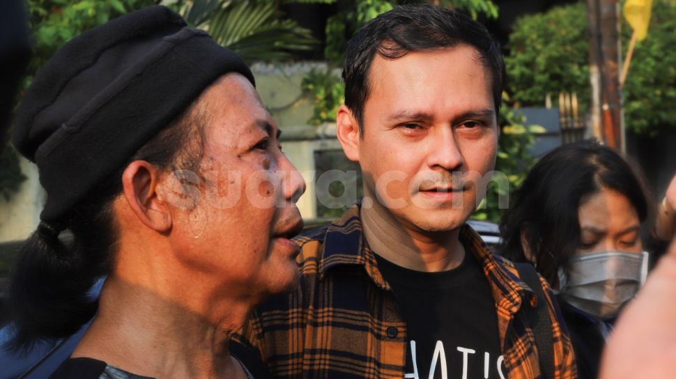 Aktor Yusuf Surya (kiri) dan Ivan Ray (kanan) saat menemui awak media di rumah duka Indra Bruggman di Tebet, Jakarta Selatan, Jumat (18/9). [Suara.com/Alfian Winanto]
