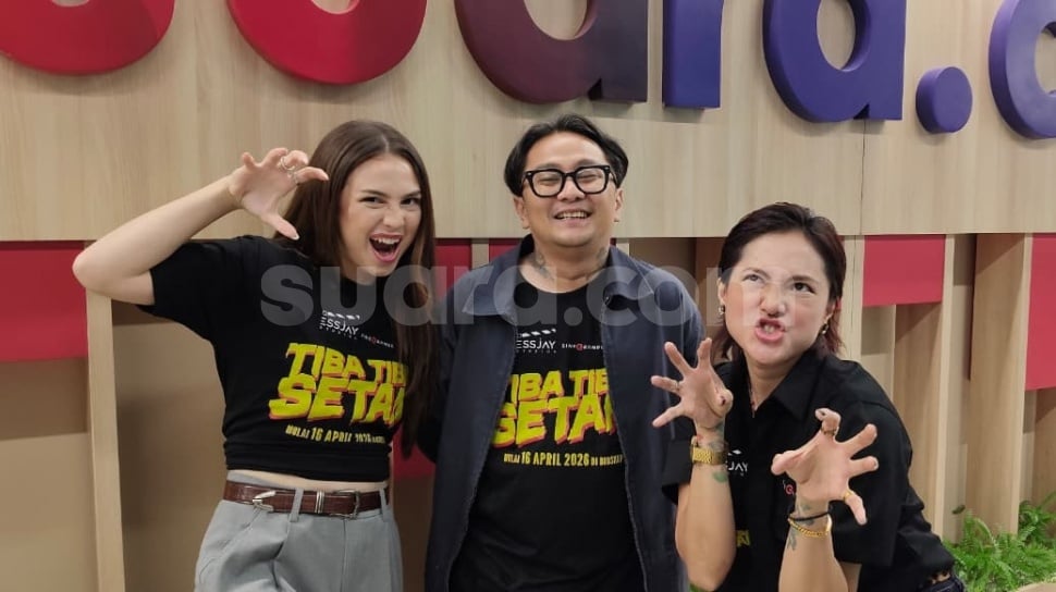 Amara Angelica, Issi (sutradara) dan Poppy Sovia, bintang film Tiba-tiba Setan saat ke kantor Suara.com pada Senin, 6 April 2026. [Suara.com/Rena Pangesti]