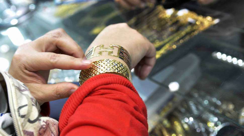 Seorang pengunjung mencoba cincin di sentra penjualan emas, Permata Cikini di Jalan Pegangsaan Barat, Jakarta, Sabtu (15/2). [MATAMATA/ Adrian Mahakam]