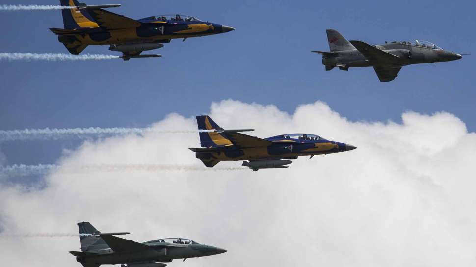 Suara.com - Pesawat tempur Hawk MK-53 (kanan) dikawal tiga pesawat T-50i Golden Eagle dalam upacara penyambutan penerbangan terakhir Hawk MK-53 di Lapangan Udara Adisutjipto, Yogyakarta, Kamis (12/3). Pesawat yang telah mengabdi selama 35 tahun tersebut resmi pensiun, selanjutnya akan di tempatkan di Museum Dirgantara Yogyakarta dan digantikan dengan pesawat T-50i Golden Eagle. ANTARA FOTO/Sigid Kurniawan