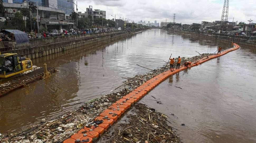 Suara.com - Petugas Dinas Kebersihan DKI Jakarta membersihkan sampah yang tersangkut di Banjir Kanal Barat (BKB) di sekitar Season City, Jakarta, Rabu (2/3). Pembersihan sungai BKB tersebut untuk mengatasi penumpukan sampah disepanjang kali dan antisipasi bahaya banjir. [suara.com/Kurniawan Mas'ud]