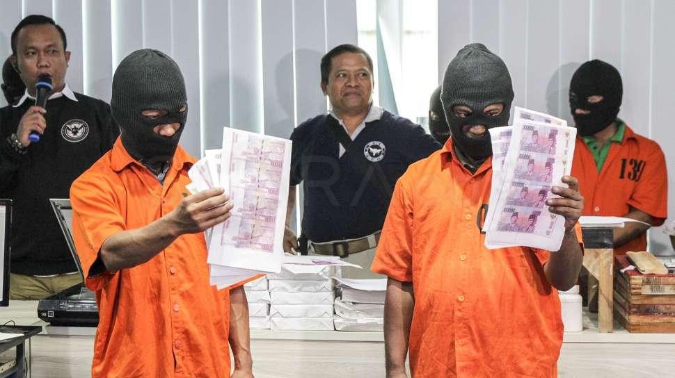 Suara.com - Dalam rilis tersebut, Polisi menangkap enam pelaku beserta barang bukti uang palsu sebanyak 313 lembar potongan kertas yang menyerupai rupiah pecahan 100 ribu beserta alat pembuat uang palsu yaitu mesin cetak offset, printer, komputer, alat sablon, dan tinta. Para pelaku ditangkap secara maraton di empat wilayah yang berbeda yaitu Majalengka, Bangkalan, Situbondo, dan Cirebon. [suara.com/Kurniawan Mas'ud].