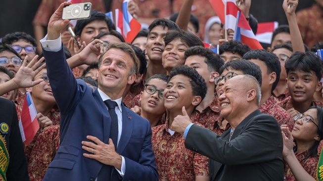 Suara.com - Presiden Prancis Emmanuel Macron (kiri) didampingi Rektor Universitas Negeri Jakarta (UNJ) Komarudin (keempat kanan) berswafoto bersama pelajar setibanya di UNJ, Jakarta, pada Rabu (28/5/2025).