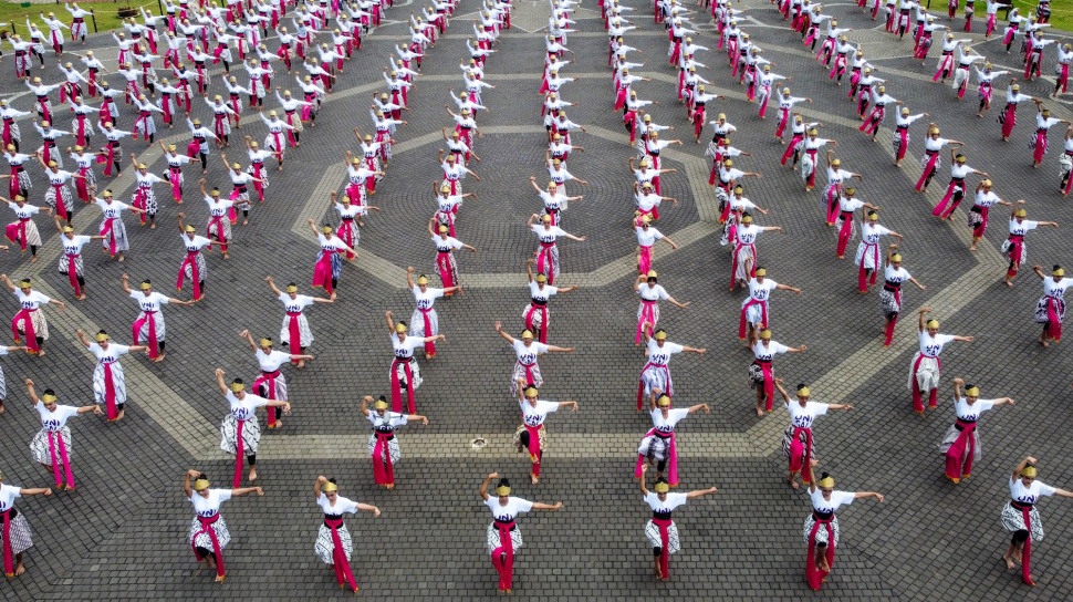 Suara.com - Foto udara sejumlah pelajar menampilkan tari kolosal Jaipong Galuh Rahayu pada Festival Konservasi dan Budaya Universitas Galuh (Unigal) di Alun-alun Ciamis, Jawa Barat, Selasa (28/10/2025).
