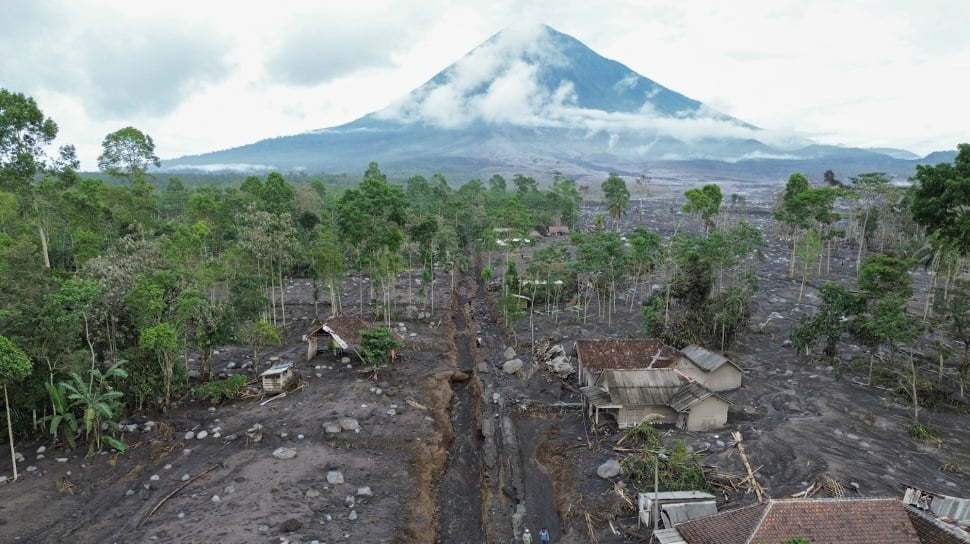 Suara.com - Foto udara kondisi perkampungan terdampak timbunan material vulkanis di Foto udara kondisi perkampungan terdampak timbunan material vulkanis di Desa Supiturang, Pronojiwo, Lumajang, Jawa Timur, Kamis (20/11/2025).