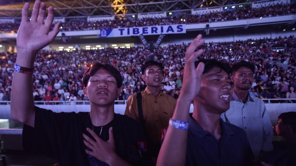 Suara.com - Jemaat berdoa pada perayaan Natal Gereja Tiberias Indonesia di Stadion Utama Gelora Bung Karno, Jakarta Pusat, Sabtu (6/12/2025). Perayaan Natal Gereja Tiberias yang digelar setiap Sabtu pekan pertama bulan Desember dihadiri sekitar seratus ribu Jemaat.