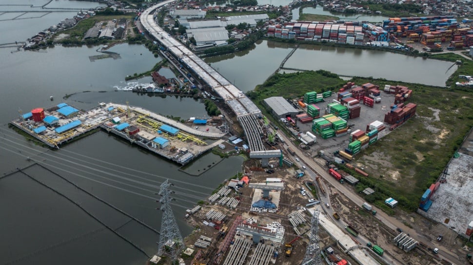 Suara.com - Foto udara suasana pengerjaan proyek pembangunan Jalan Tol Semarang-Demak Seksi 1 di Semarang, Jawa Tengah, Senin (15/12/2025).
