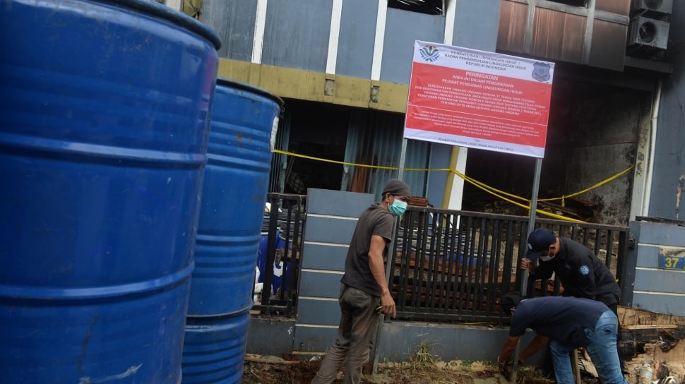 Suara.com - Petugas Penegakan Hukum (Gakkum) Kementerian Lingkungan Hidup memasang plang penyegelan di gudang pestisida milik PT. Biotek Saranatama di Kota Tangerang Selatan, Banten, Jumat (13/2/2026).