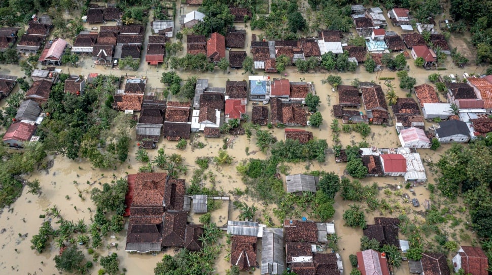 Suara.com - Foto udara kondisi banjir yang menggenangi Desa Tinanding, Kecamatan Gubug, Kabupaten Grobogan, Jawa Tengah, Selasa (17/2/2026). [L