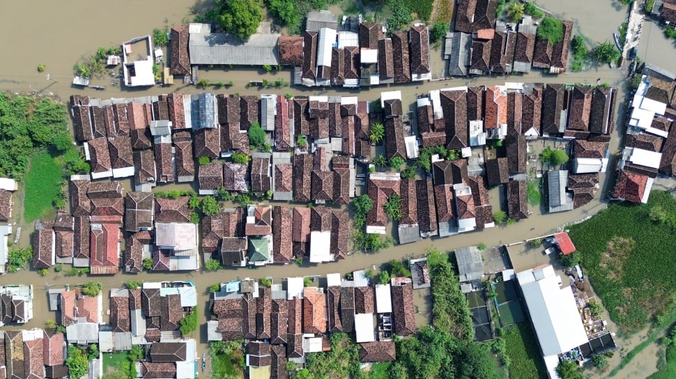Suara.com - Foto udara sejumlah rumah yang terendam banjir di Desa Kedungringin, Beji, Pasuruan, Jawa Timur, Rabu (25/3/2026). Hujan dengan intensitas cukup tinggi dalam beberapa hari terakhir di daerah itu mengakibatkan banjir dan merendam ratusan rumah.