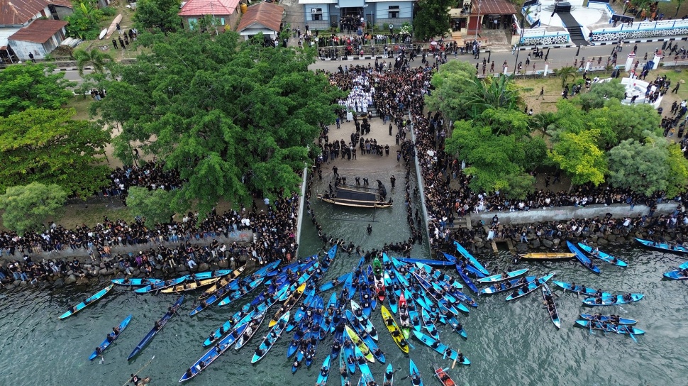Suara.com - Foto udara arak-arakan prosesi Laut Semana Santa tiba di Pantai Kuce, Larantuka, Nusa Tenggara Timur, Jumat (3/4/2026).