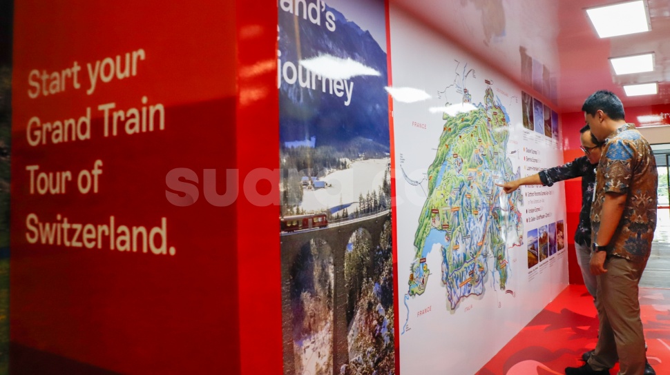 Kedutaan Besar Swiss menyelenggarakan pameran di area Stasiun Whoosh Halim, Jakarta, yang menghadirkan instalasi bertema pariwisata Swiss.