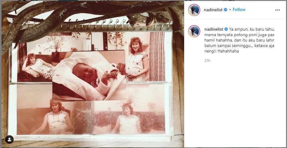 "Ya, ampun. Ku baru tahu, Mama ternyata potong poni juga pas hamil. Hahaha. Dan itu aku baru lahir belum sampai seminggu. Ketawa aja, Neng! Hahahaha," ungkap Nadine dalam keterangan foto yang diunggah.