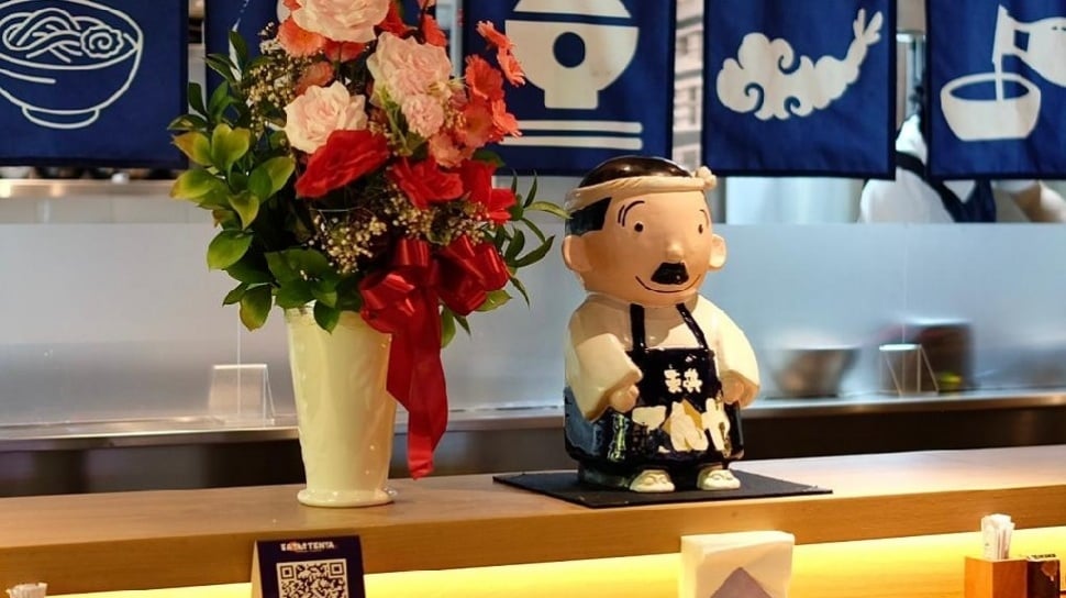Begitu memasuki gerai Gandaria City, suasana Jepang langsung terasa melalui interior bernuansa kayu hangat, noren biru bergambar ikon ramen, tempura, dan teh yang menggantung rapi, serta pencahayaan lembut yang menghadirkan atmosfer nyaman.