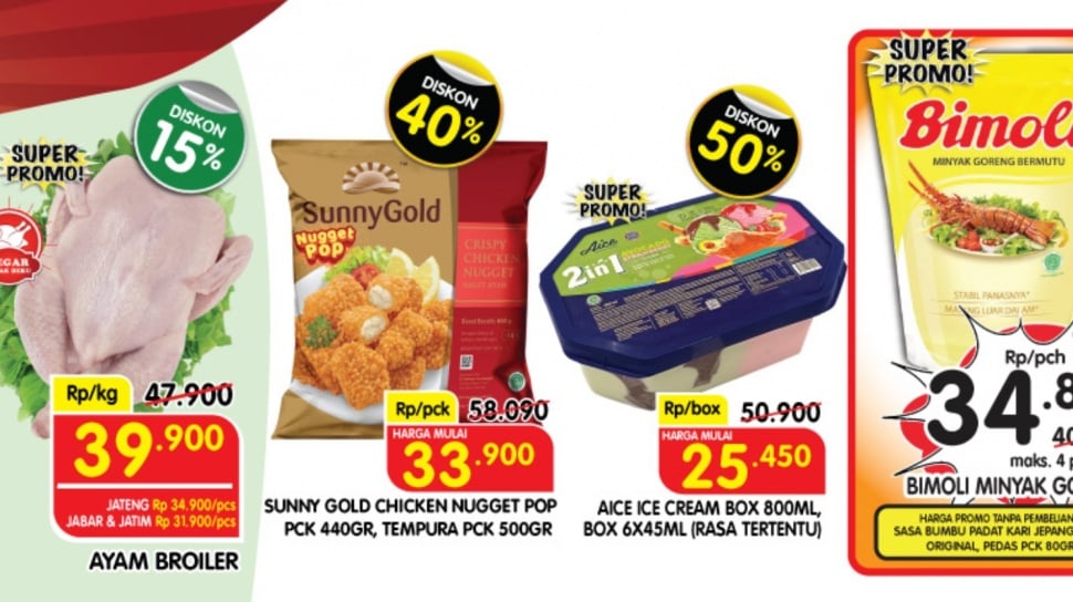 • Dapatkan diskon besar untuk daging rendang, ayam broiler, ikan shishamo, dan minyak goreng Bimoli super murah.