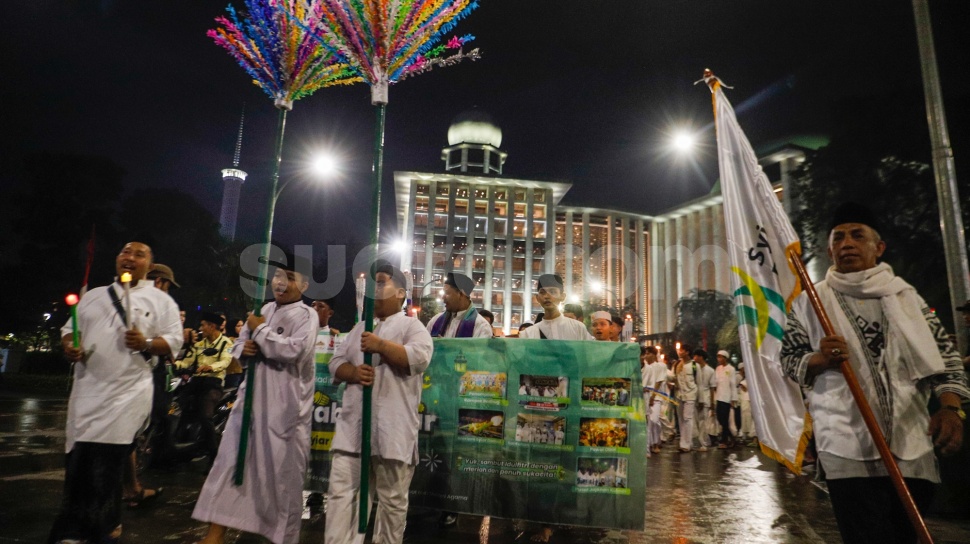 Sejumlah warga melakukan pawai obor malam takbiran di kawasan Masjid Istiqlal, Jakarta, Selasa (9/4/2024). [Suara.com/Alfian Winanto]