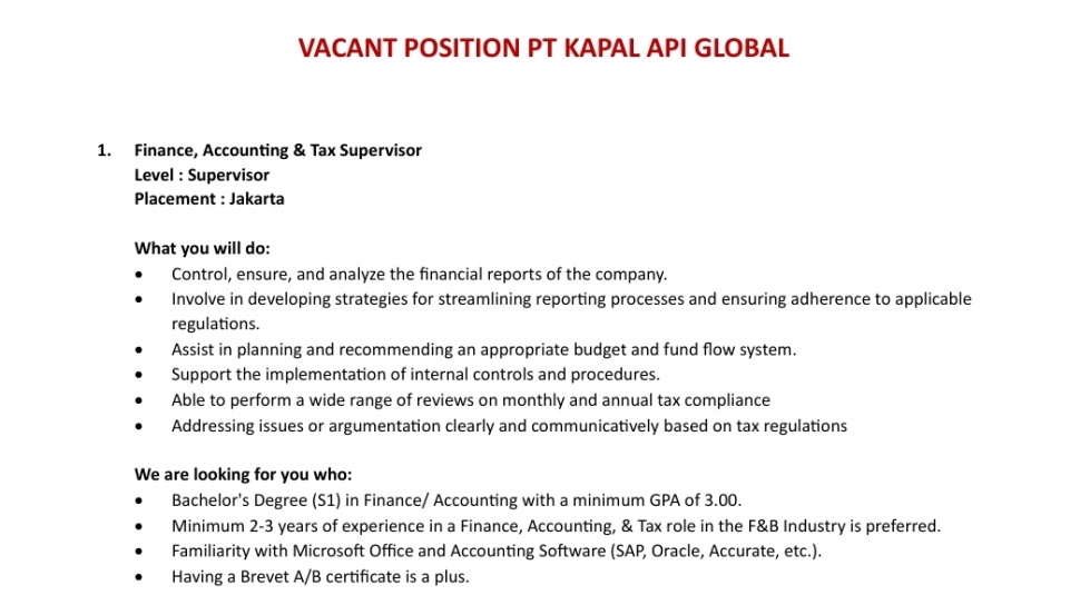 - Kapal Api Group membuka banyak lowongan kerja di berbagai anak perusahaan.