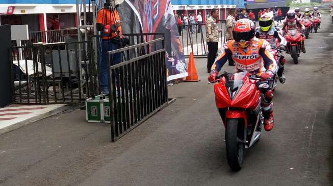 Suara.com - Juara dunia MotoGP, Marc Marquez, sempat memberikan tips-tips dasar membalap sepeda motor bagi 16 pebalap remaja Indonesia dari Astra Honda Racing School di Sirkuit International Sentul, Jawa Barat, Selasa (25/10/2016).