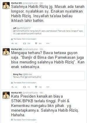 "Mengapa terharu?Bahwa tertawa guyon saja. "Banjir di Bima dan Pamekasan juga bisa menuding salahnya Habib Riziq". Kan enak selesainya," lanjut Mahfud.