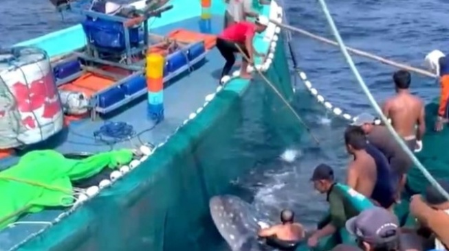Tak mudah membebaskan makhluk laut seberat itu. Diperlukan waktu sekitar 30 menit bagi para nelayan untuk melepaskan hiu paus dari jaring.