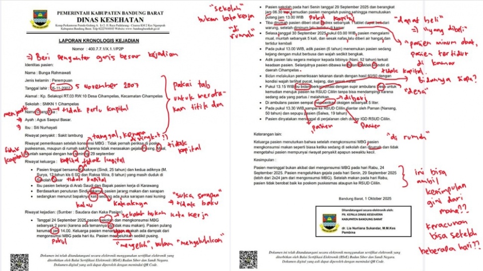 Laporan kronologi yang menyangkal siswi BR meninggal karena MBG lantas menjadi sorotan netizen setelah hasil tangkapan dari keterangan versi Dinkes Pemkab Bandung Barat beredar di X.
