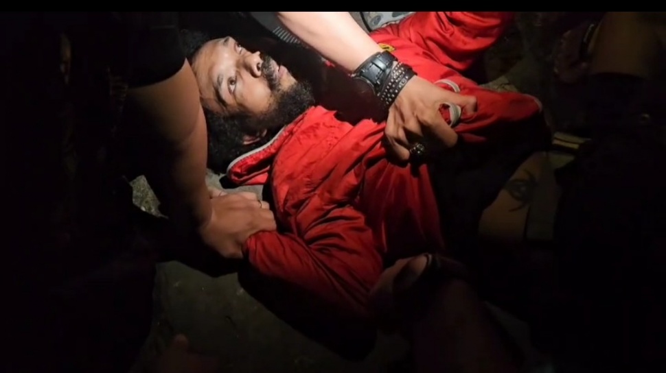 Awalnya, pelaku terlihat tergeletak di samping sepeda motornya yang terbalik. Petugas lalu dengan sigap memegangi tangan dan tubuhnya.