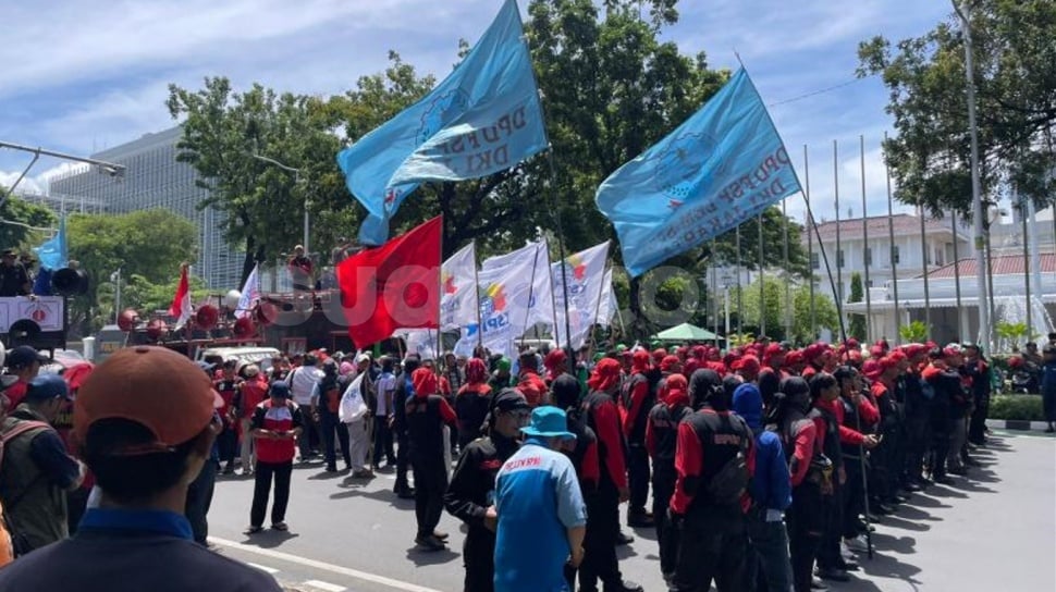 Ratusan buruh memenuhi area Medan Merdeka Selatan sambil membawa atribut organisasi dan poster tuntutan.Di tengah kerumunan, seorang orator meminta agar Pemerintah Provinsi (Pemprov) DKI memenuhi tuntutan mereka.