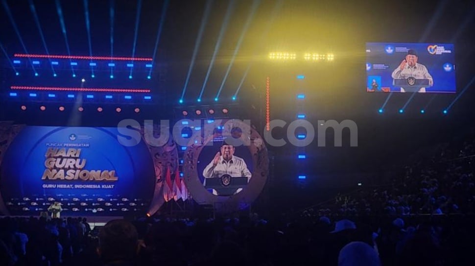 Hal itu disampaikan Prabowo dalam pidatonya di Puncak Peringatan Hari Guru Nasional di Indonesia Arena, Jakarta.