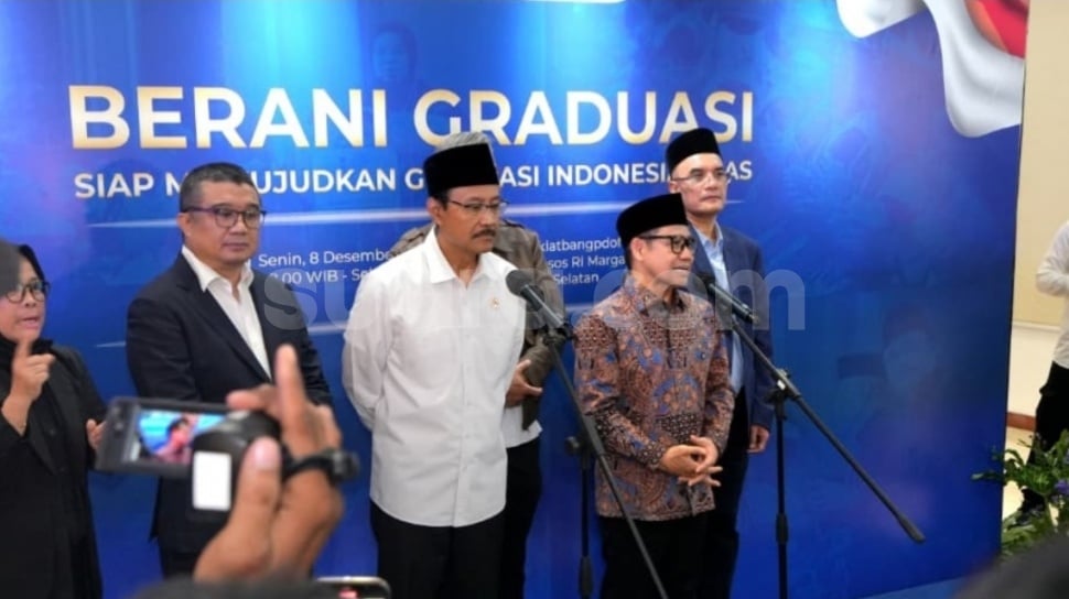Suara.com - Menteri Koordinator Pemberdayaan Masyarakat Muhaimin Iskandar bersama Menteri Sosial Saifullah Yusuf atau Gus Ipul dan Wamensos Agus Jabo Priyono menggraduasi 133 Keluarga Penerima Manfaat (KPM) Program Keluarga Harapan (PKH).
