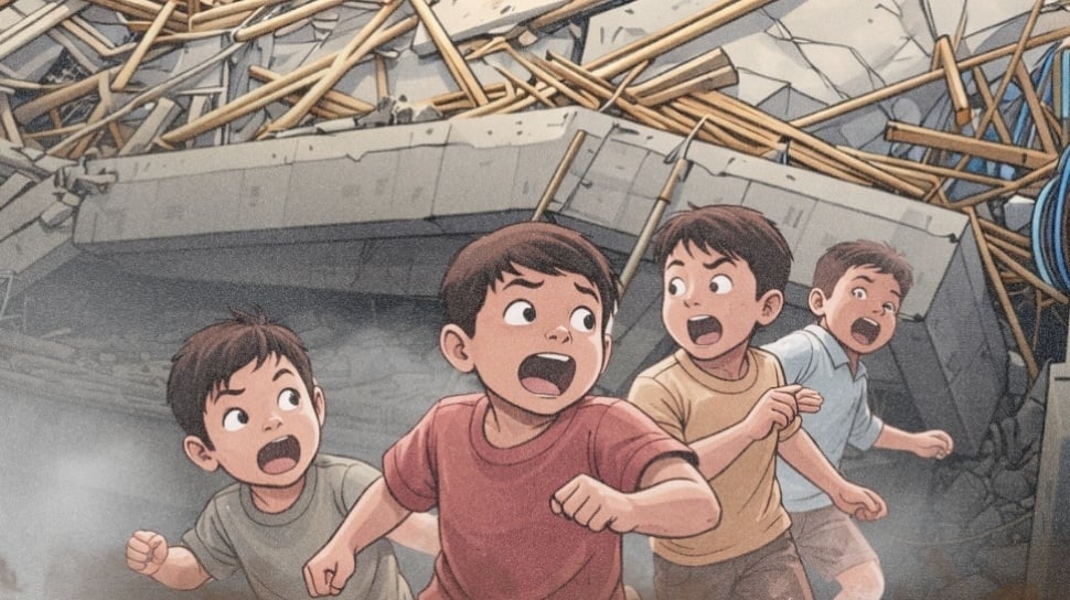 - Anak-anak yang bermain di dekat lokasi berhasil selamat dari reruntuhan.