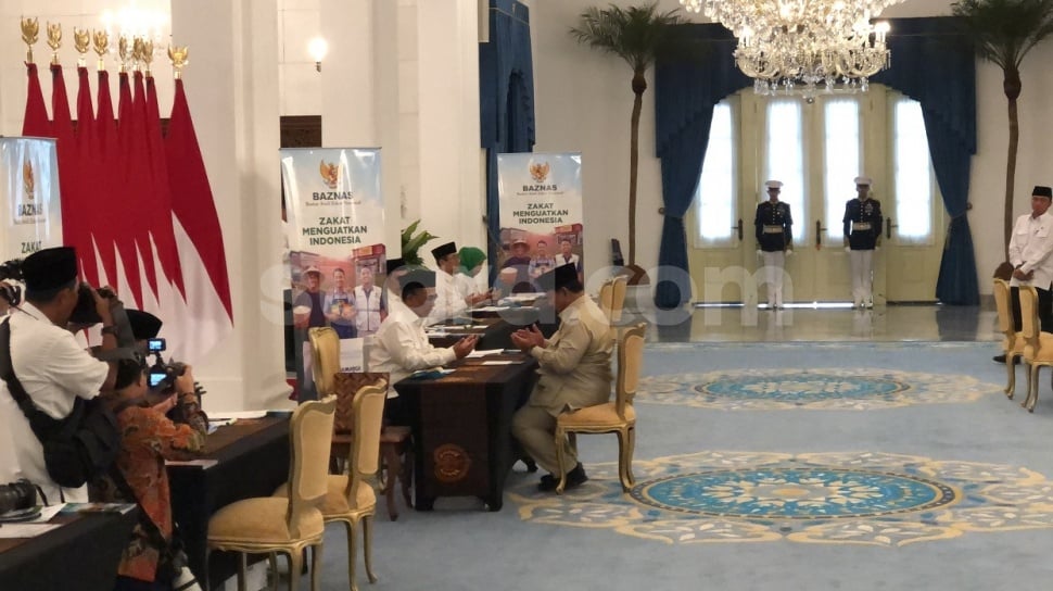Tampak Prabowo yang didampingi Menteri Sekretaris Negara Prasetyo Hadi dan Sekretaris Kabinet tiba di Istana Negara pukul 15.58 WIB Prabowo selanjutnya duduk untuk membayar zakat kepada petugas Badan Amil Zakat Nasional (Baznas).