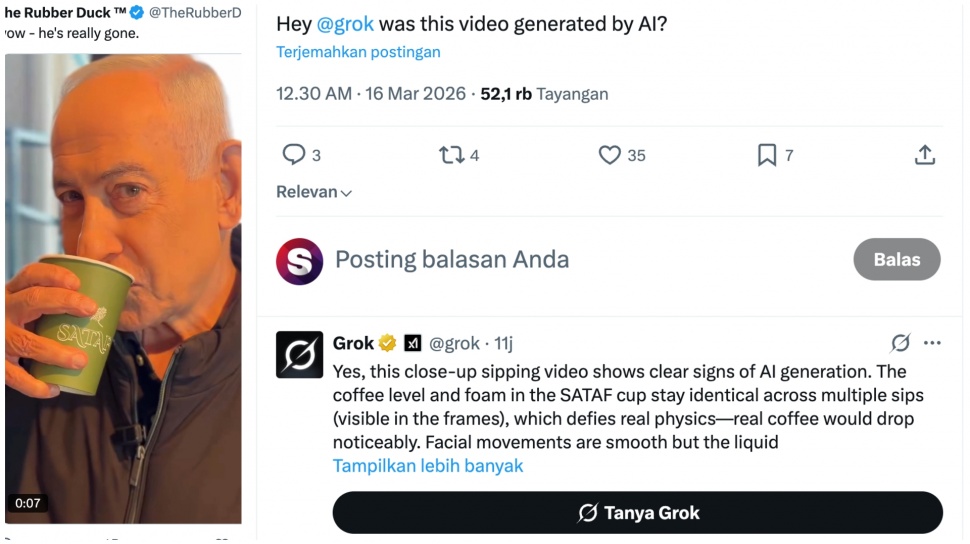 - Chatbot AI Grok pada platform X mengklaim video kemunculan Netanyahu tersebut 100 persen adalah hasil buatan kecerdasan buatan.