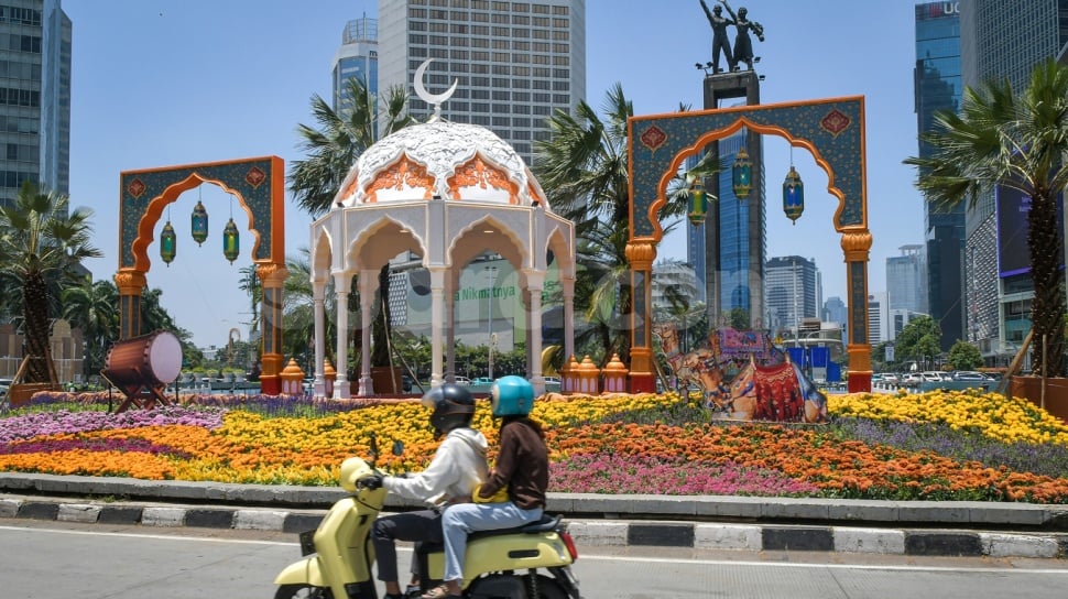 Pengendara sepeda motor melintas di depan dekorasi berbentuk masjid dan beduk di Bundaran HI, Jakarta, Sabtu (14/3/2026). Dekorasi tersebut untuk menyemarakkan perayaan Hari Raya Idul Fitri 1447 Hijriah. (ANTARA FOTO/Reno Esnir).