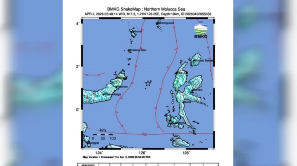 BMKG merilis pusat gempa yang terjadi di antara Provinsi Maluku Utara dan Sulawesi Utara, Kamis (2/4/2026). (ANTARA/HO-BMKG)
