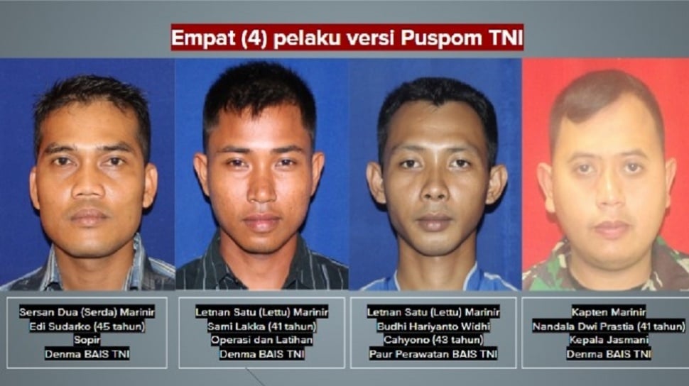 Keempat pelaku yang kekinian berstatus terdakwa tersebut terdiri dari tiga perwira dan satu bintara. Mereka adalah Kapten Nandala Dwi Prastia (NDP), Lettu Budhi Hariyanto Widhi (BHW), Lettu Sami Lakka (SL), dan Serda Edi Sudarko (ES).