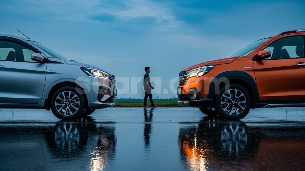 Ilustrasi perbandingan Suzuki Ertiga Hybrid vs XL7 Hybrid (Suara x Gemini)