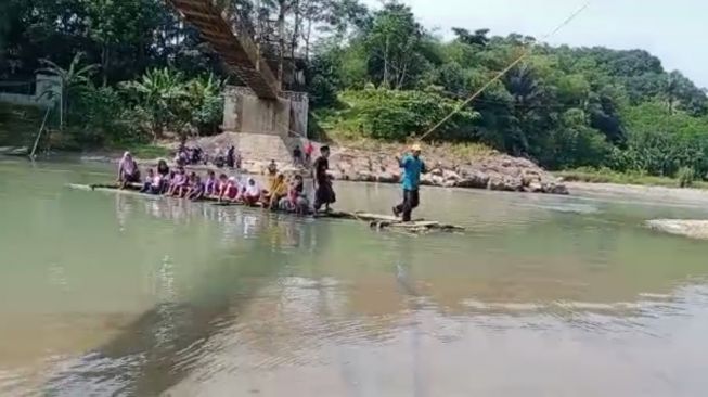 Ya belakangan ini jembatan itu heboh karena masyarakat harus menggunakan rakit untuk menyeberangi sungai Ciberang. Apalagi, ada anak-anak yang berangkat sekolah.