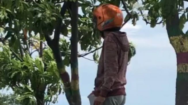 Pria itu kerap muncul di Kawasan Coastal Area dengan menggunakan helm sebagai penutup kepala dan juga mengenakan masker.