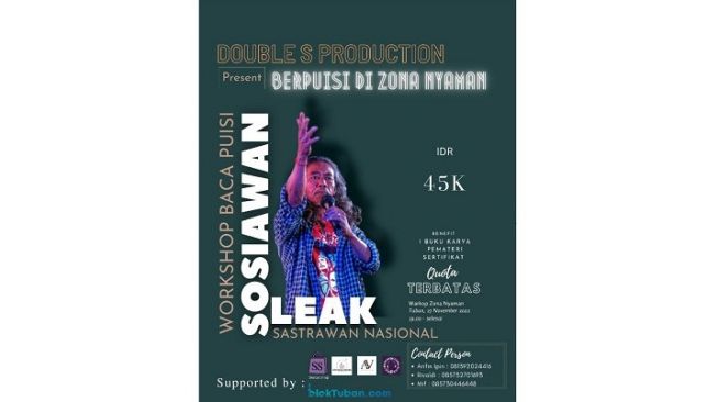 Namun, bagi kalian yang masih bingung mempelajari teknik membaca puisi yang baik, tidak perlu khawatir. Pasalnya, para sastrawan di Kabupaten Tuban akan mengadakan workshop baca puisi pada 27 November 2022 mendatang, dengan menghadirkan sastrawan nasional, yaitu Sosiawan Leak.