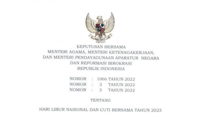 DIALEKSIS.COM | Jakarta - Pemerintah telah menyepakati dan menetapkan Hari Libur Nasional dan Cuti Bersama Tahun 2023. Kesepakatan tersebut tertuang dalam Surat Keputusan Bersama (SKB) Menteri Agama, Menteri Ketenagakerjaan, Menteri Pendayagunaan Aparatur Negara dan Reformasi Birokrasi Nomor 1066 Tahun 2022, Nomor 3 Tahun 2022, Nomor 3 Tahun 2022 tentang Hari Libur Nasional dan Cuti Bersama Tahun 2023.