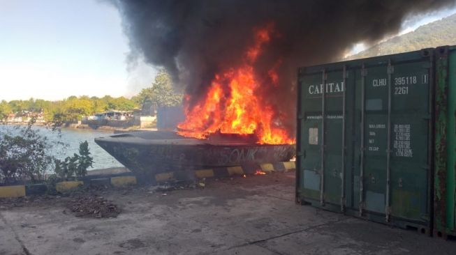 digtara.com – Sebuah kapal bekas jenis speed boat milik syahbandar Larantuka, Kabupaten Flores Timur, NTT terbakar, Sabtu (24/7/2021).